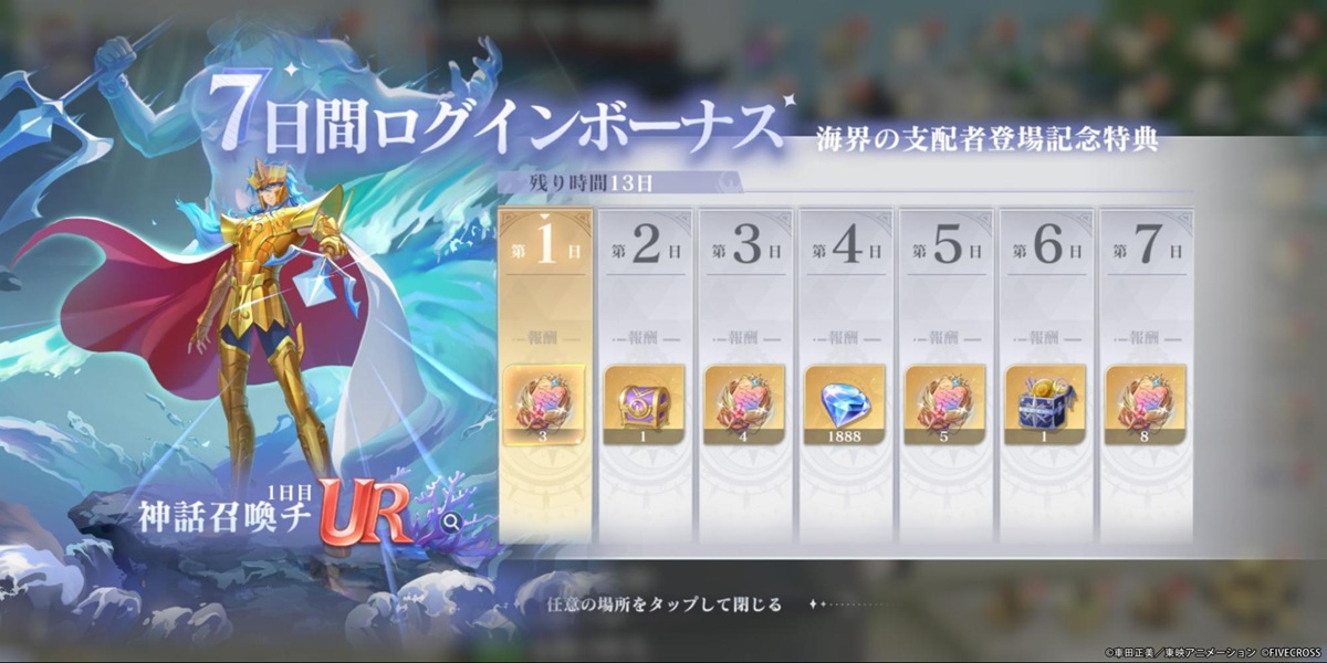 合計7日間ログインすることで「神話召喚チケット×20」「召喚チケット選択宝箱×1」「ブルーダイヤ×1888」、さらに「選択宝箱・聖域闘士フィギュア(橙)×1」をもらえるチャンス!お見逃しなく!