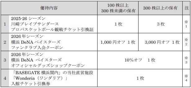 ※4:入館チケット引換券は、2026年春にグランドオープンを予定している「BASEGATE 横浜関内」の同社直営施設「Wonderia(ワンダリア)」にて、所定の期間で利用できる。期間や利用方法の詳細は、後日発送の株主優待証にて案内する。