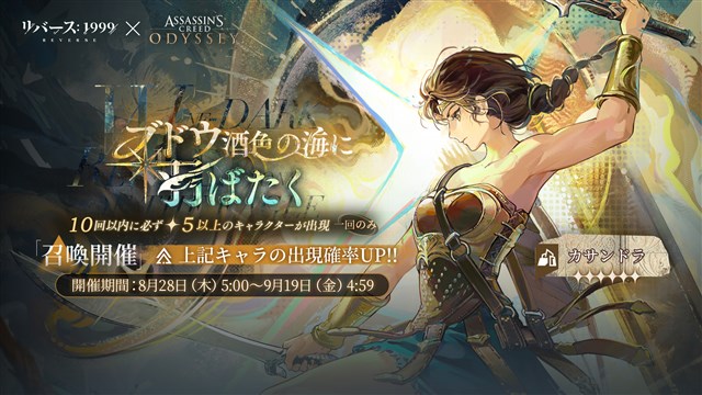 古代ギリシアを舞台とした『アサシンクリード』コラボ後半戦でも活躍する新キャラクター「カサンドラ(CV.清水理沙)」をピックアップしたコラボ召喚「ブドウ酒色の海に羽ばたく」を開催中。
