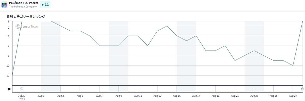 | 1 | 10 | ↑9 | Pokémon TCG Pocket | ポケモン/DeNA<2432>/クリーチャーズ |