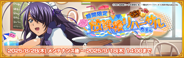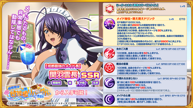 8月28日より開始した「放課後リハーサルガチャVol.1」では、新たに「【成都最強のメイド長】関羽雲長」(CV: 生天目 仁美)が登場! 同ガチャでは、「【成都最強のメイド長】関羽雲長」の排出率が、ほかの同レアリティの闘士より高くなっている。