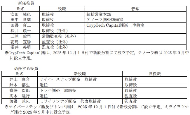また、役員人事については以下のとおり。これらの人事は持株会社体制への移行に向けたグループ全体の経営体制とガバナンス強化のために実施する。