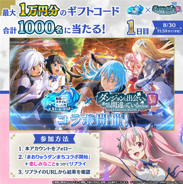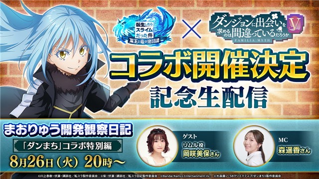 バンダイナムコエンターテインメントは、『転生したらスライムだった件 魔王と竜の建国譚』(以下まおりゅう)において 、8月29日より「ダンジョンに出会いを求めるのは間違っているだろうか(以下ダンまち)」とのコラボを開始した。