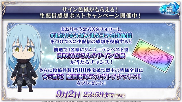1名にリムル=テンペスト役 岡咲美保さんのサイン色紙が当たるキャンペーンを開催中!さらに、投稿件数1500件突破で全てのお客様に★5確定魔国褒章スカウトチケット×1をプレゼント!「#まおりゅうダンまちコラボ生配信」を付けて、Xに感想を投稿しよう!
