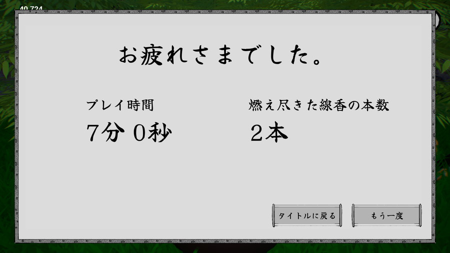 すべての線香の火を消してはいけない。これが本作の唯一のルール。風が強いほど線香の火は消えやすくなるので、マウスを使い風向きを操作したり、新たに線香を追加するタイミングを見計らうことでより長く火を保つことができる。
