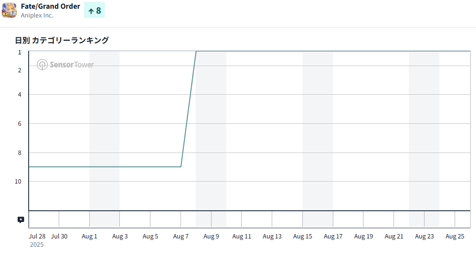 週の初めである8月25日には、『Fate/Grand Order』が首位を維持し、その後も8月26日まで18日連続で首位をキープする強さを見せた。