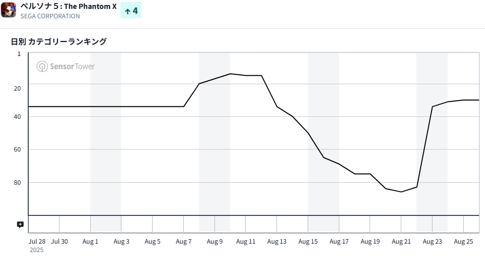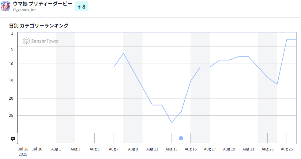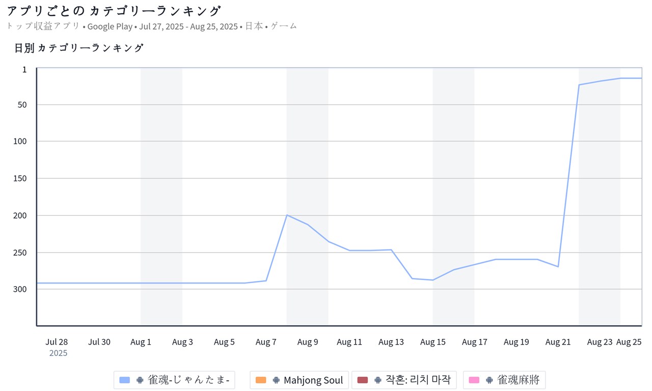 8月25日に『雀魂-じゃんたま-』が15位に急浮上した。期間限定イベントや新雀士の登場が順位上昇の要因となった。