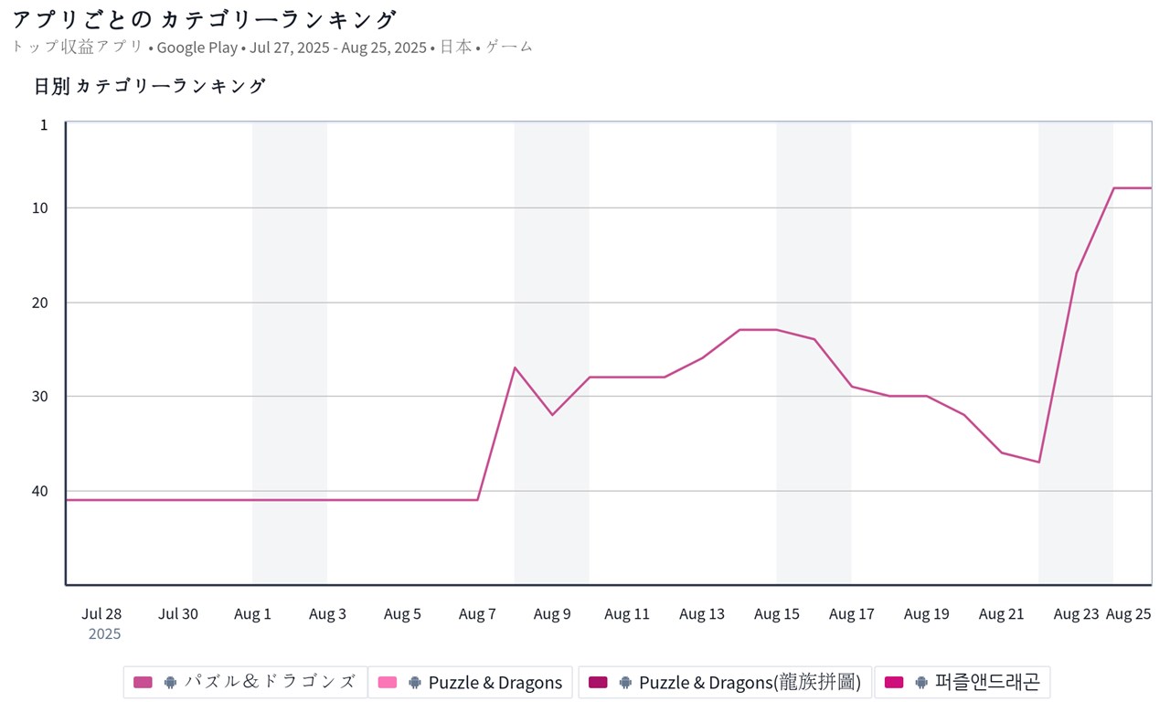 8月25日に『パズル&ドラゴンズ』が8位に急浮上し、8月26日も続伸して7位となるなど、「鬼滅の刃」コラボイベントが売上に大きく貢献した。