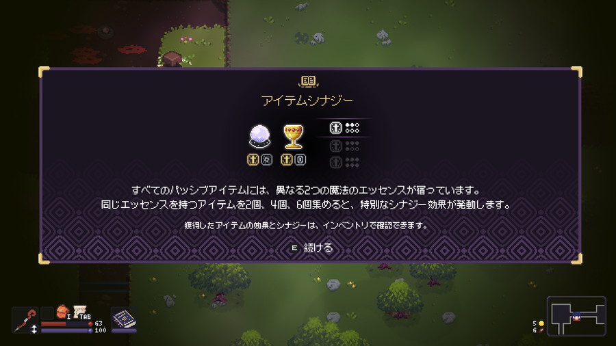 ダンジョン内には多数の武器やアイテムがあり、2種類の魔法のエッセンスを持つパッシブアイテムを2個、4個、6個集めることで強力なシナジー効果が発動する。