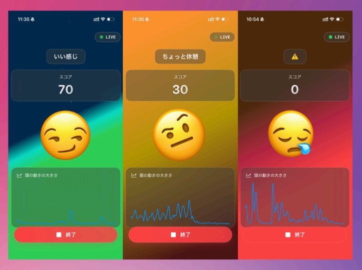 ・アプリの内容 … AirPodsとスマホアプリを組み合わせて、作業中の姿勢バランスを整えるアプリ「Flow」を開発した。AirPodsに搭載したセンサーを活用し、姿勢の状態を計測。そのデータに応じてUIが変化していく仕組みを実装し、アプリのデザイン性や完成度の高さが大きく評価した。また、計測データをグラフで可視化することで、ユーザーが継続的に利用したくなるモチベーション設計も光った。さらに、短時間で精度の高いデータが取りにくい環境の中、自ら検証を繰り返し確かな成果を出した点も高く評価され、最優秀賞を受賞した。