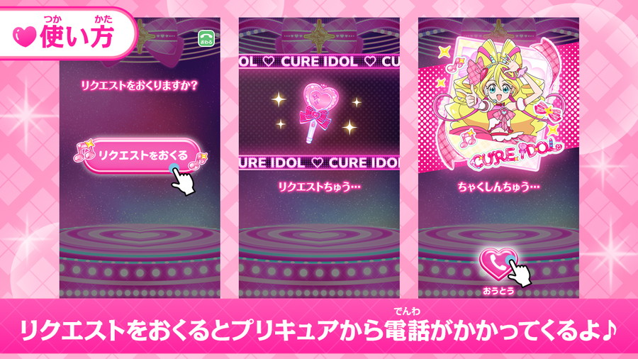 このアプリは、「おはようも、おやすみも、応援してほしい時も!いつだってプリキュアといっしょ」をコンセプトとしたスマートフォン向けの仮想電話アプリ。