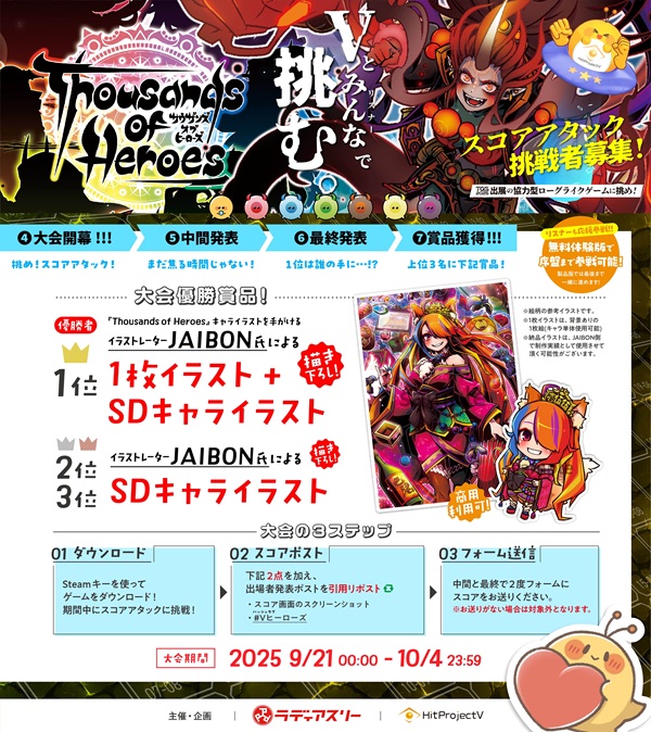 ダンジョン攻略で最高得点を出したVTuberには、このゲームのイラストレーター JAIBON氏による、優勝VTuberのキャラクター描き起こしイラストをプレゼント!!