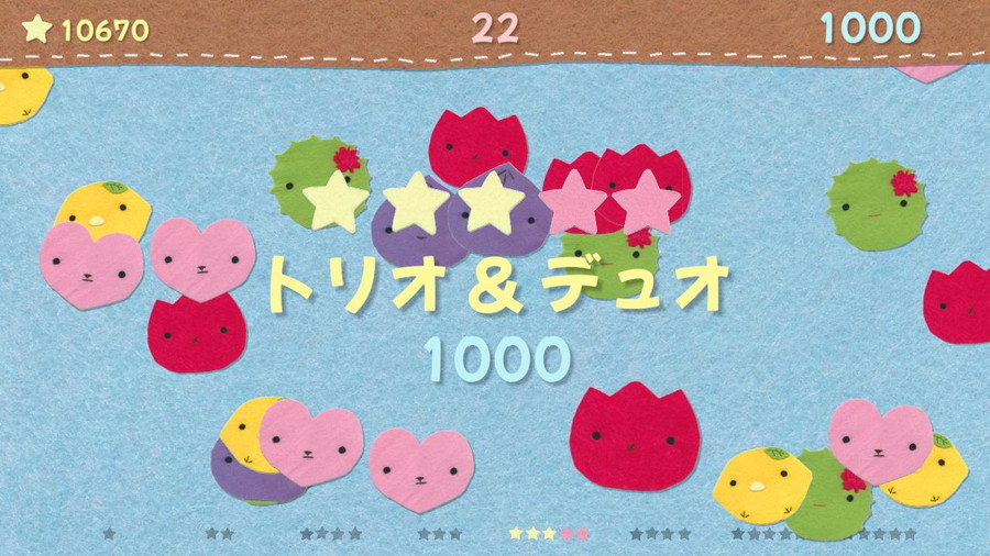 集めたキャラクターの色の組み合わせで役が成立。難易度の高い役ほどスコアもアップし、戦略的なプレイが高得点のカギとなる。一度のプレイで全ての役を揃えると、特別なボーナスも獲得できる。