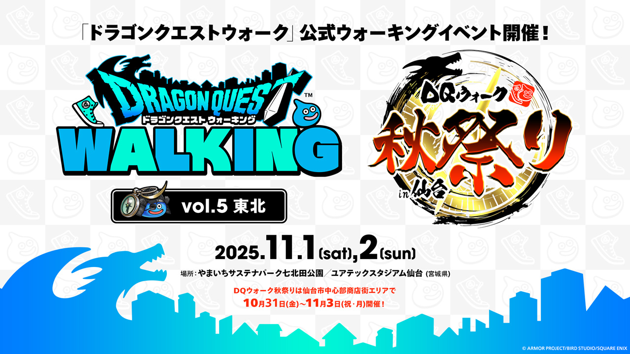 スマートフォン向け位置情報RPG『ドラゴンクエストウォーク』(対応機種:iOS/Android)は、2025年11月1日(土)・2日(日)に第五回リアルウォーキングイベント『ドラゴンクエストウォーキング<東北>』を宮城県仙台市にて開催する。あわせて2025年10月31日(金)~11月3日(月・祝)に『ドラゴンクエストウォーク秋祭り』を仙台市中心部商店街エリアにて開催する。