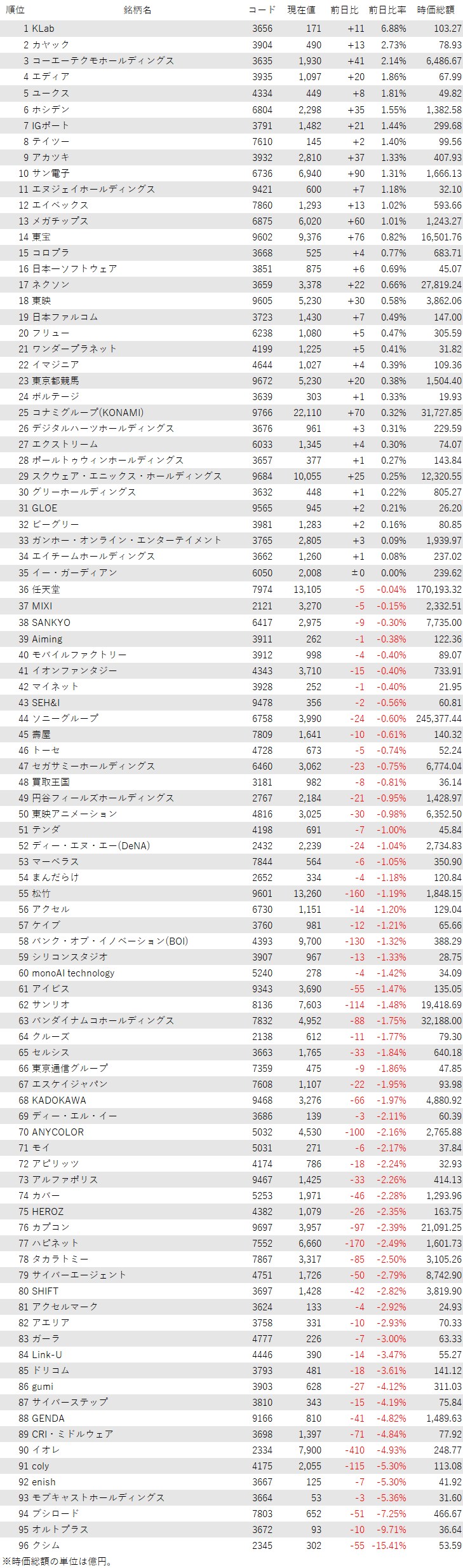 そうした中でゲーム・エンタメ関連株の動きを見てみると、下記の表に登録しているゲーム・エンタメ関連企業96銘柄のうち、上昇は34銘柄(35%)、下落は61銘柄(64%)、変わらずは1銘柄(1%)で、下落した銘柄が多数を占めた。