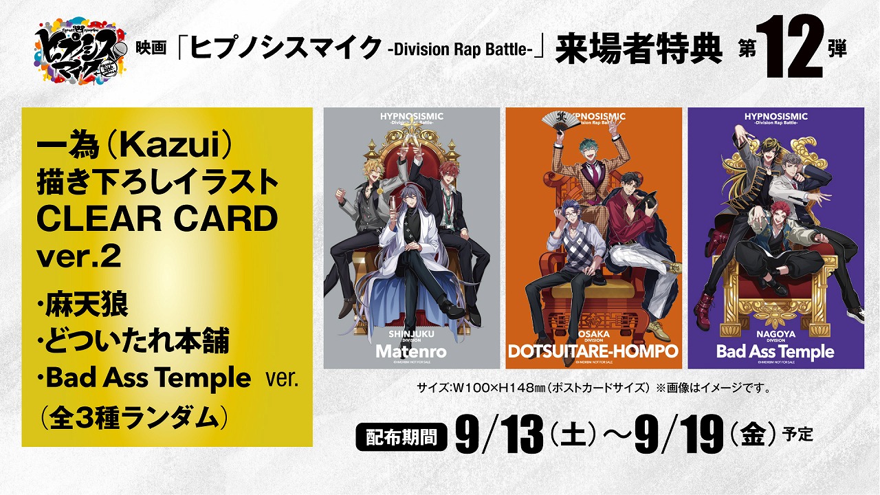 また、来場者特典第11弾として「一為(Kazui)描き下ろしイラストCLEAR CARD ver.2 [Buster Bros!!!/MAD TRIGGER CREW/Fling Posse ver.](全3種ランダム)」を9月12日(金)まで、第12弾の「一為(Kazui)描き下ろしイラストCLEAR CARD ver.2 [麻天狼/どついたれ本舗/Bad Ass Temple ver.](全3種ランダム)」を9月13日(土)~9月19日(金)まで配布する。