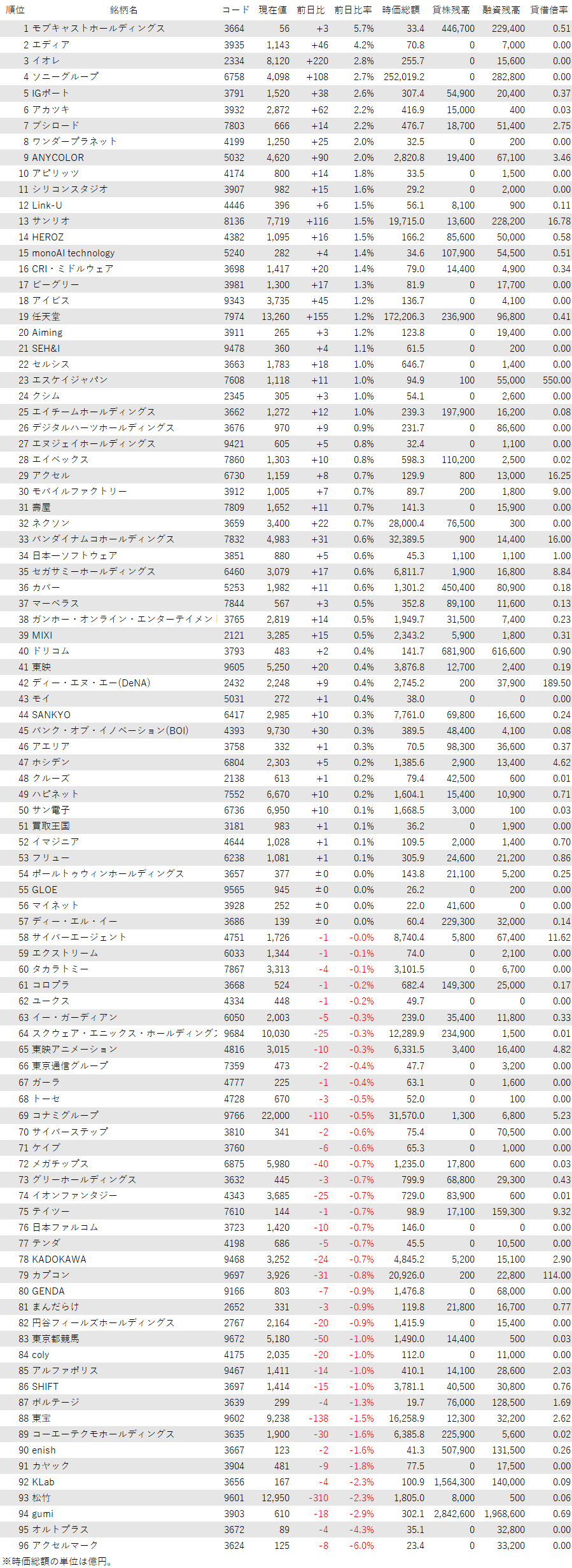 最後に騰落ランキングを見ると、モブキャストHD<3664>やエディア<3935>、イオレ<2334>、ソニーG<6758>が値上がり率上位となり、アクセルマーク<3624>、オルトプラス<3672>、gumi<3903>、松竹<9601>が値下がり率上位となった。