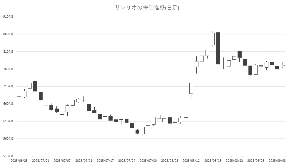 アニメやホビーなどその他コンテンツ関連銘柄は、サンリオ<8136>、IGポート<3791>、エディア<3935>、フリュー<6238>、ブシロード<7803>が高く、タカラトミー<7867>、東宝<9602>、KADOKAWA<9468>、GENDA<9166>、東映アニメ<4816>が安い。