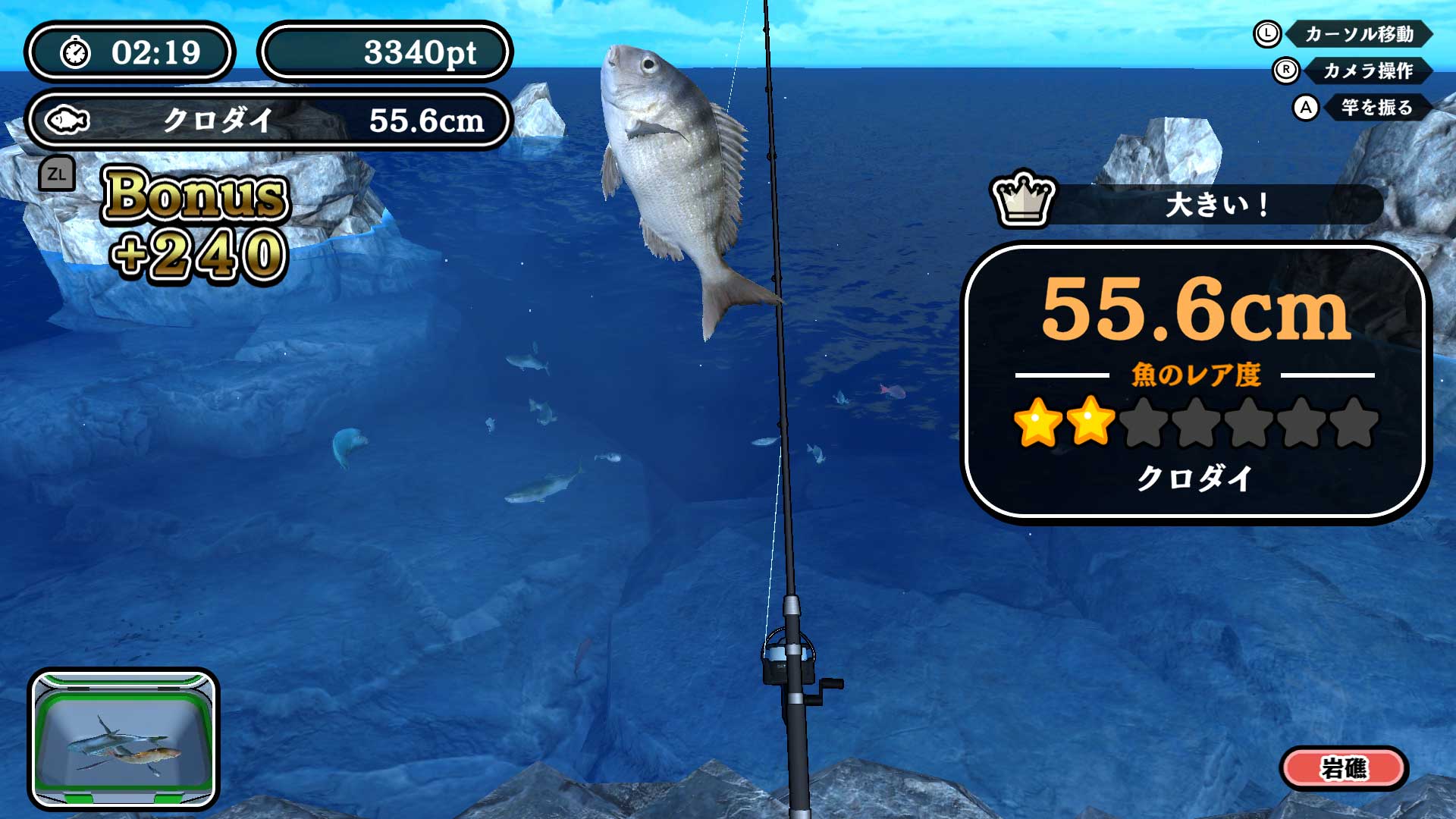・スコアアタック:制限時間内に多くの魚を釣り、高スコアを目指す。大物を狙えば高得点のチャンスが広がる。釣り場に応じて適した竿やルアーを使い分ける戦略性も求められる。