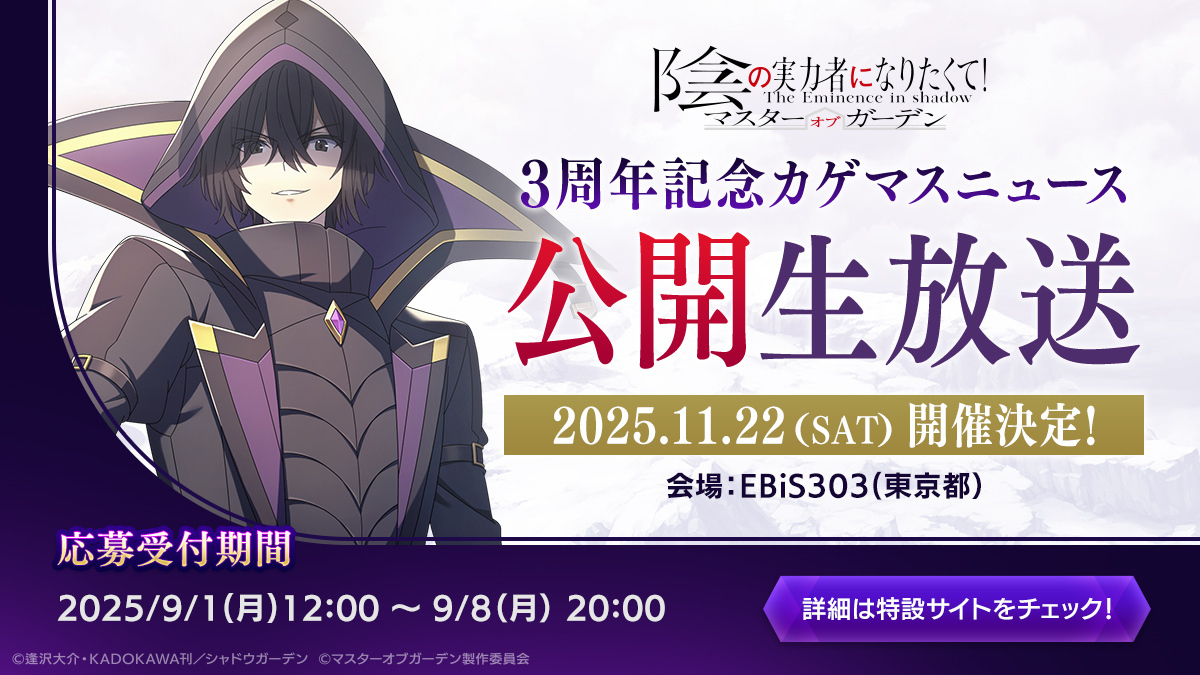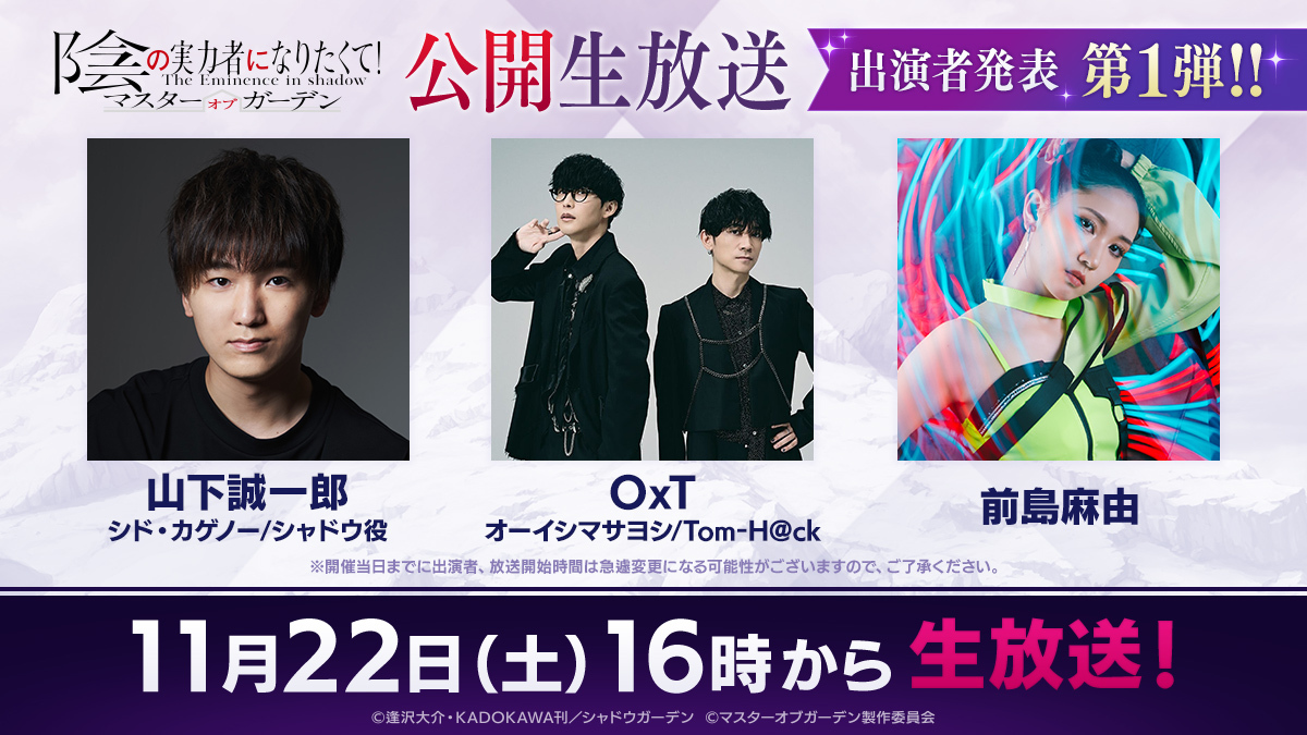 2025年11月22日(土)開催予定の「3周年記念カゲマスニュース 公開生放送」の第1弾出演者として、山下誠一郎さん(シド・カゲノー/シャドウ役)、「陰の実力者になりたくて!」楽曲を担当するOxTさん、前島麻由さんを発表!