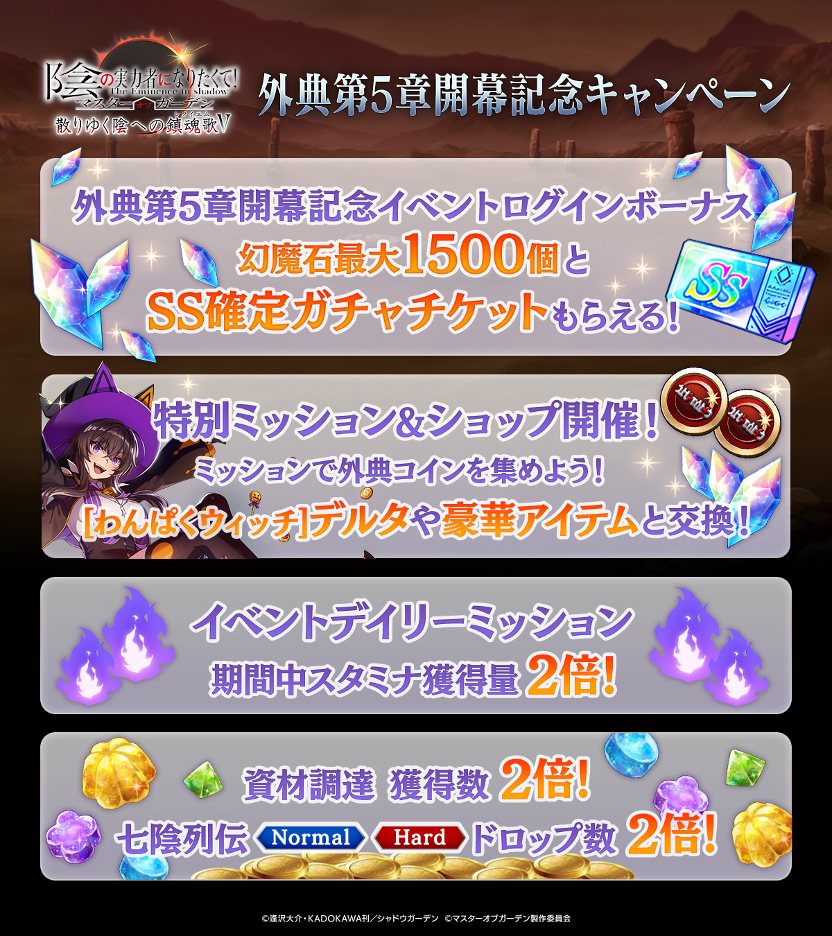 外典『散りゆく陰への鎮魂歌Ⅴ』の開幕を記念して、最大1,500個の幻魔石とSS確定ガチャチケットがゲットできるログインボーナスを実施! さらに、特別ミッションに挑戦して「外典コイン」を集めると、SSキャラ[わんぱくウィッチ]デルタや幻魔石など豪華報酬が獲得できる!