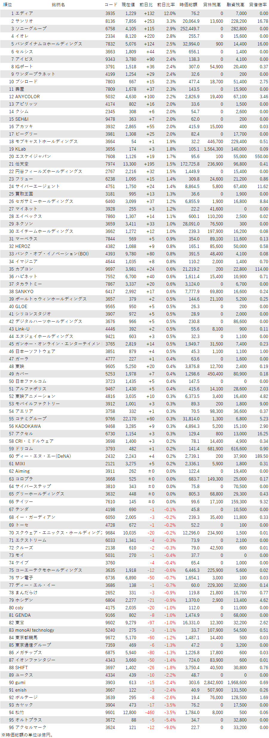 こうしたなか、ゲーム・エンタメ関連企業をみると、登録されている96銘柄のうち、上昇は61銘柄(64%)、下落は30銘柄(31%)、変わらずは5銘柄(5%)で、買い優勢だった。