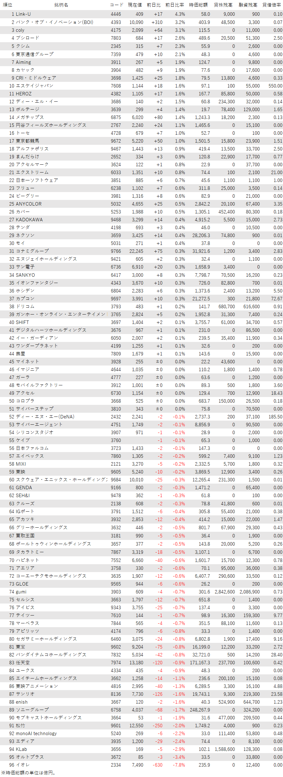 こうしたなか、ゲーム・エンタメ関連企業をみると、登録されている96銘柄のうち、上昇は44銘柄(46%)、下落は45銘柄(47%)、変わらずは7銘柄(7%)で、売り優勢だった。主力株は、朝方は買い優勢の銘柄が多かったが、買い一巡後は上値の重さが目立つ。