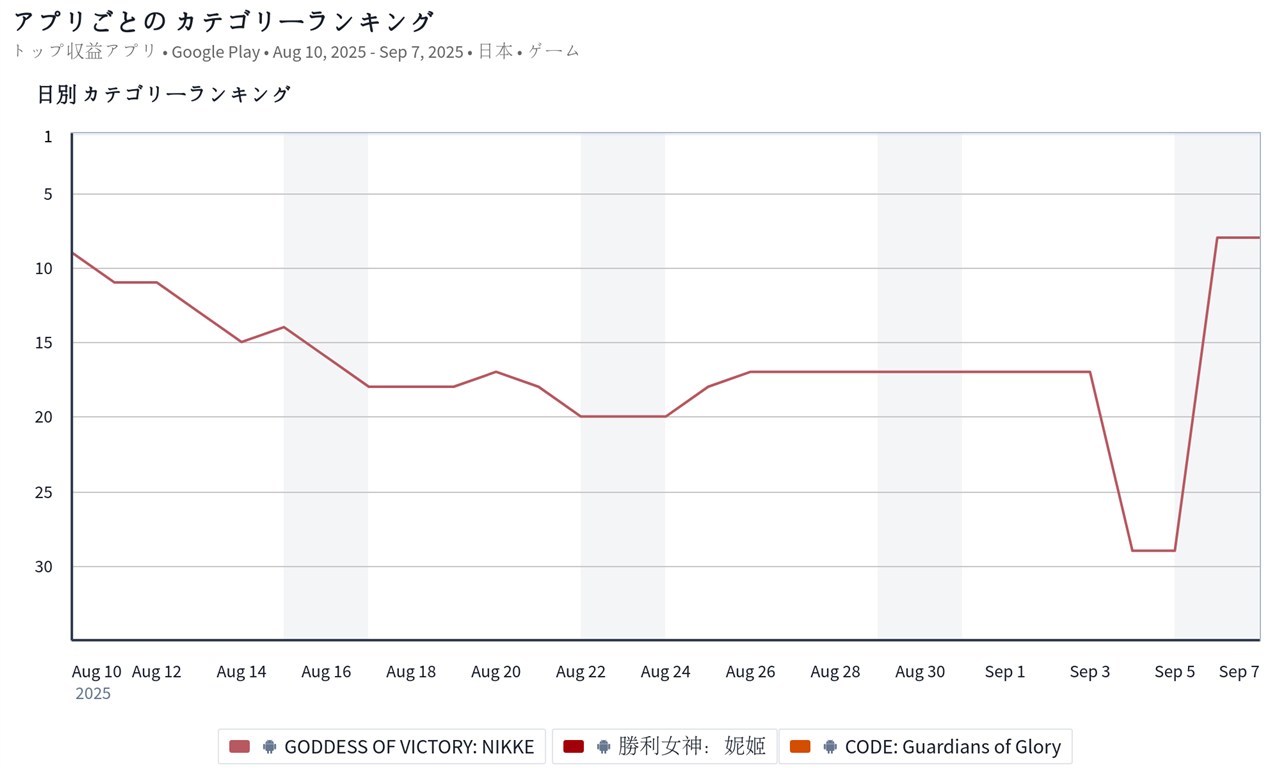 トップ10圏内では、Level Infiniteの『勝利の女神:NIKKE』が8位に急上昇してきた。『NIKKE』は、9月4日より、新SSRニケ「エード:エージェントバニー」(CV:安野希世乃)が登場し、その特殊募集を開始していることなどが足元の売上に大きく貢献しているようだ。