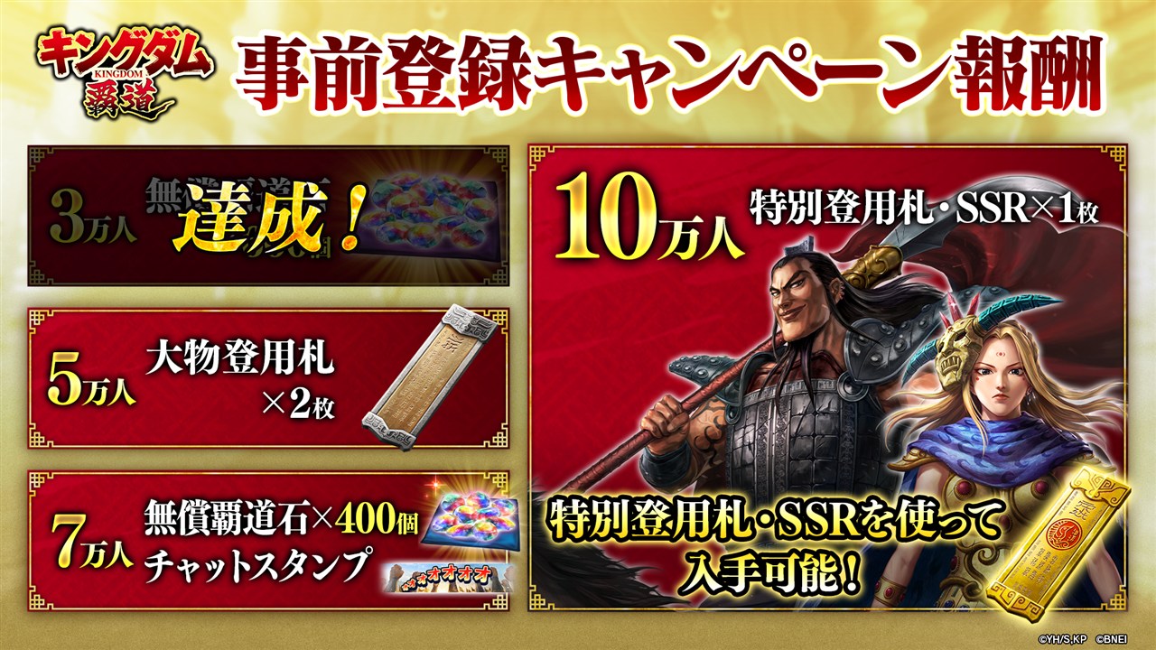 『キングダム 覇道』の事前登録者数が早くも3万人を突破した。事前登録者数3万人達成報酬として、ゲーム開始時に全ユーザーに大物登用(ガシャ)に使える「無償覇道石」×600個を配布する。