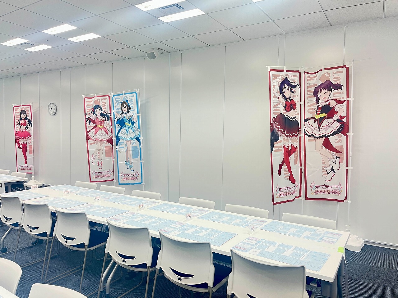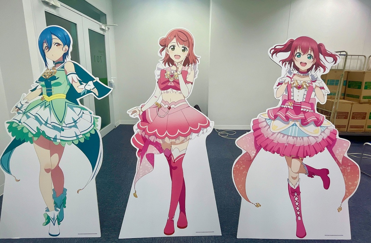 ラブカ描きおろし魔法少女風衣装を着たAiScReamのメンバーのスタンディに加え、ライブのトッピングメンバーやラブ♡ブースターゲストののぼりの展示も行った。