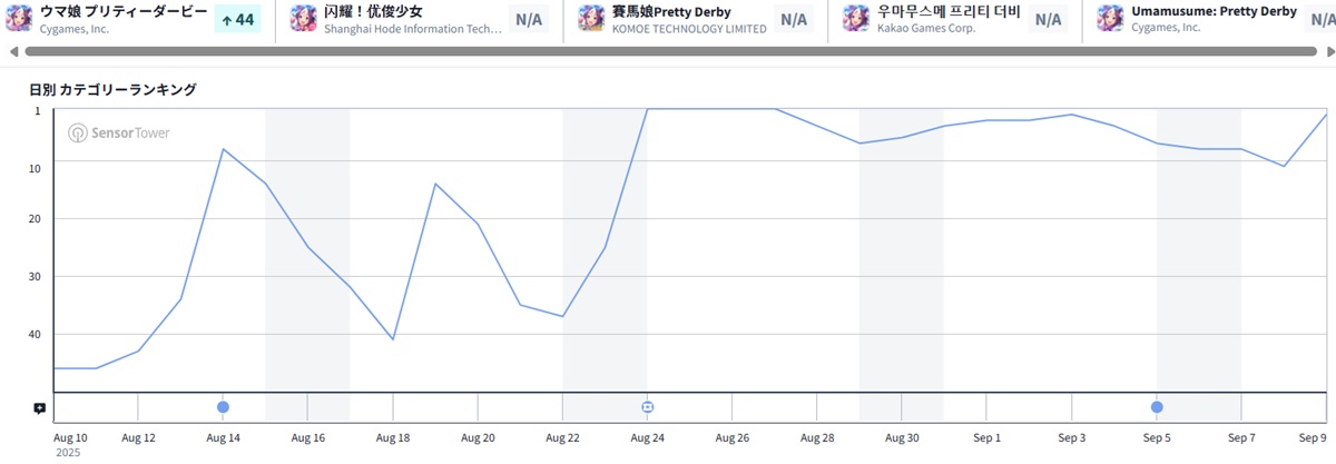 そうした中、Cygamesの『ウマ娘 プリティーダービー』が前日11位から2位に浮上した。