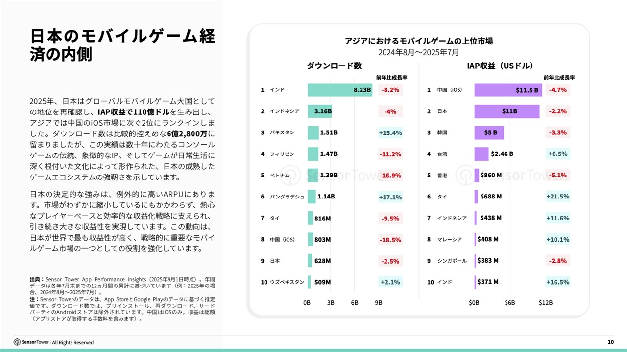 2025年、日本はグローバルモバイルゲーム大国としての地位を再確認し、IAP収益で110億ドルを生み出し、アジアでは中国のiOS市場に次ぐ2位にランクインした。ダウンロード数は比較的控えめな6億2800万に留まったが、この実績は数十年にわたるコンソールゲームの伝統、象徴的なIP、そしてゲームが日常生活に深く根付いた文化によって形作られた、日本の成熟したゲームエコシステムの強靭さを示している。