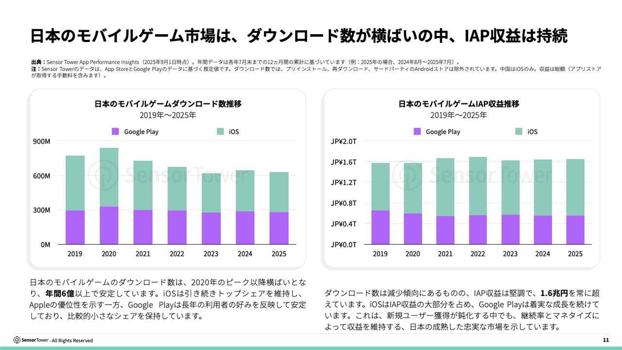 ダウンロード数は減少傾向にあるものの、IAP収益は堅調で、1.6兆円を常に超えている。iOSはハイバリューユーザーを通じてIAP収益の大部分を占め、Google Playは着実な成長を続けている。これは、新規ユーザー獲得が鈍化する中でも、継続率とマネタイズによって収益を維持する、日本の成熟した忠実な市場を示している。