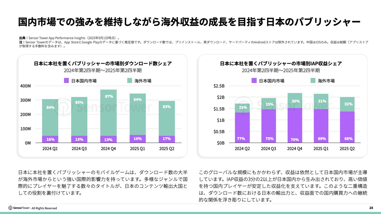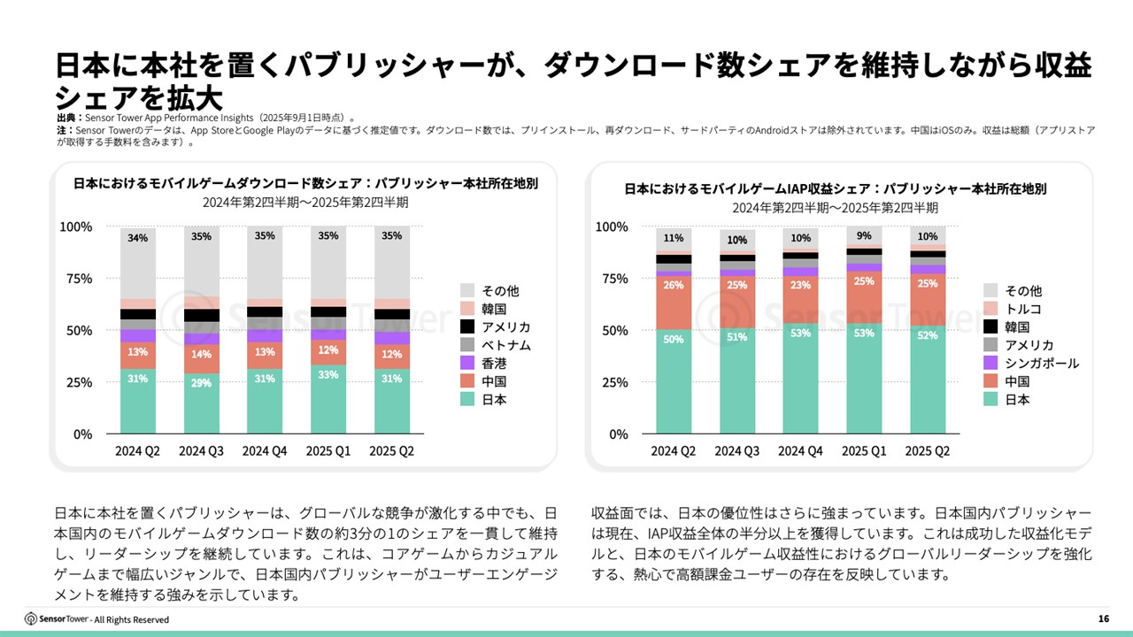 収益面では、日本の優位性はさらに強まっている。日本国内パブリッシャーは現在、IAP収益全体の半分以上を獲得しており、これは成功した収益化モデルと、日本のモバイルゲーム収益性におけるグローバルリーダーシップを強化する、熱心で高額課金ユーザーの存在を反映している。