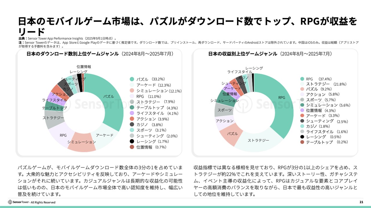 ■日本のモバイルゲーム市場は、パズルがダウンロード数でトップ、RPGが収益をリード