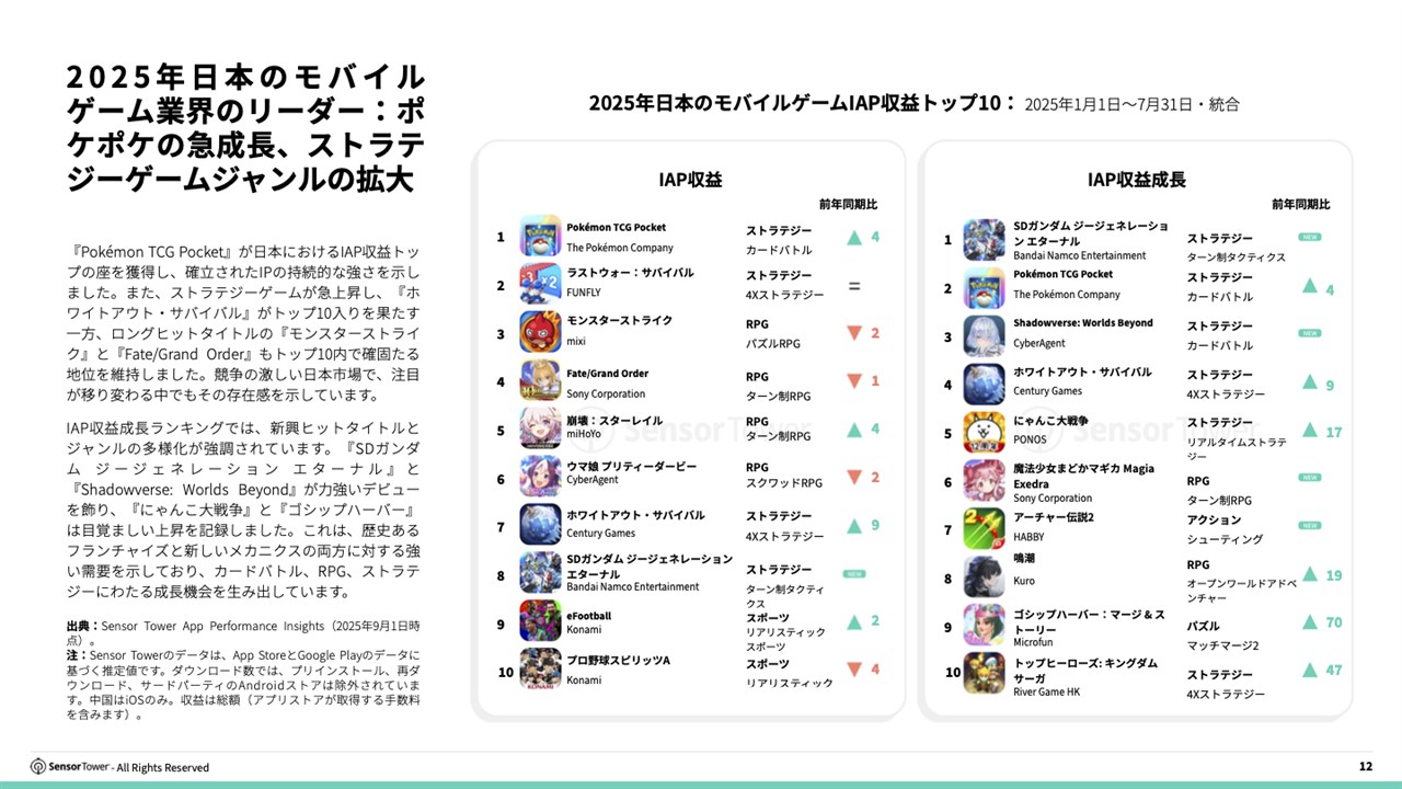 『Pokemon TCG Pocket』が日本におけるIAP収益トップの座を獲得し、確立されたIPの持続的な強さを示した。また、ストラテジーゲームが急上昇し、『ホワイトアウト・サバイバル』がトップ10入りを果たす一方、ロングヒットタイトルの『モンスターストライク』と『Fate/Grand Order』もトップ10内で確固たる地位を維持しまた。競争の激しい日本市場で、注目が移り変わる中でもその存在感を示している。