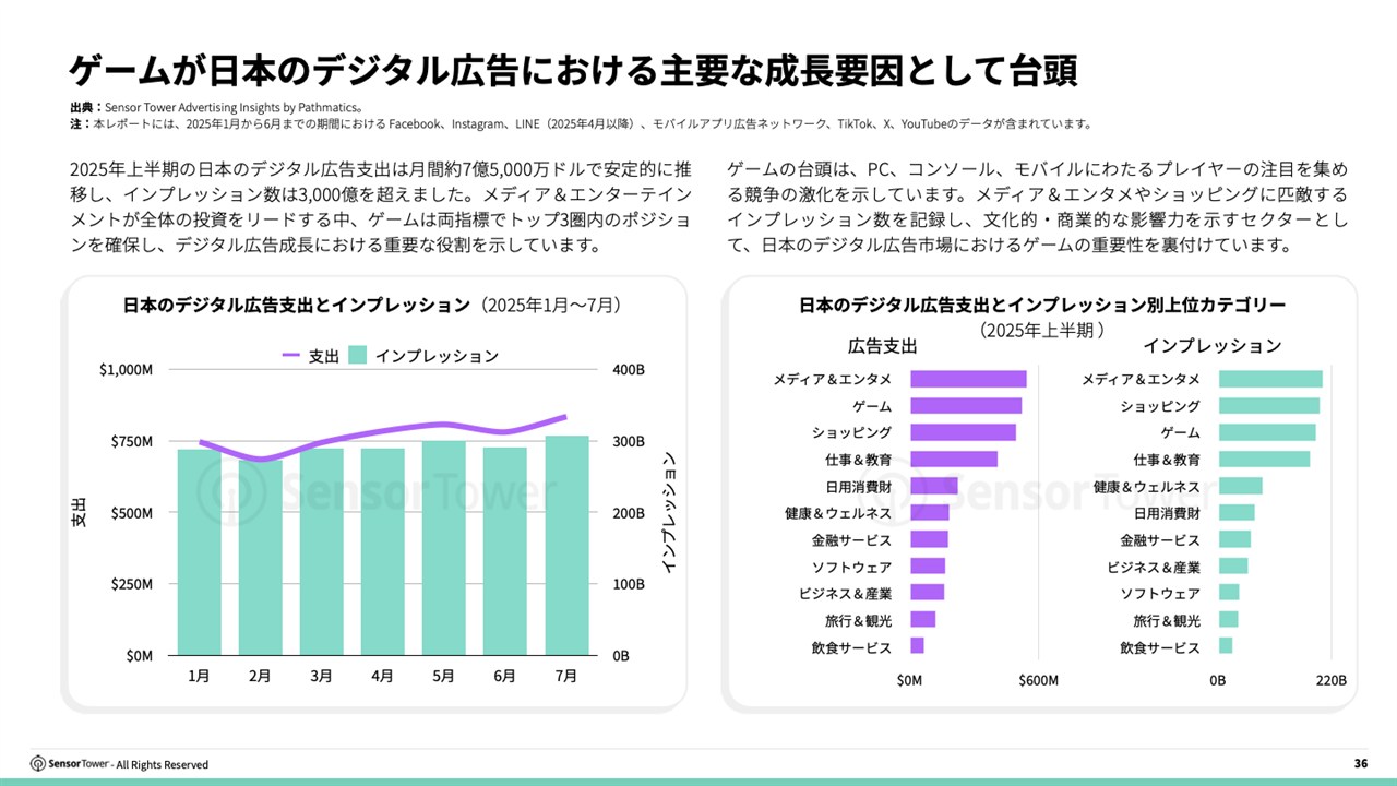 2025年上半期の日本のデジタル広告支出は月間約7億5,000万ドルで安定的に推移し、インプレッション数は3000億を超えた。メディア&エンターテインメントが全体の投資をリードする中、ゲームは両指標でトップ3圏内のポジションを確保し、デジタル広告成長における重要な役割を示している。
