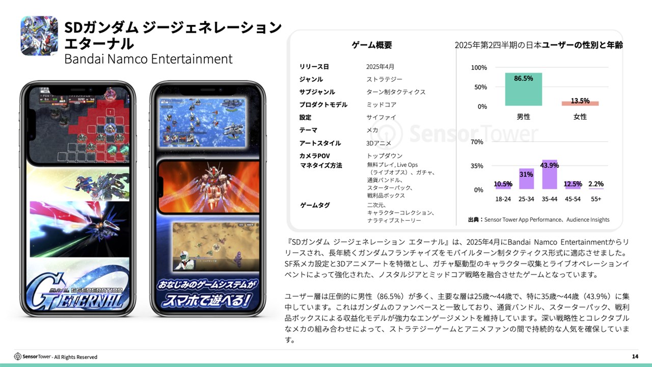 『SDガンダム ジージェネレーション エターナル』『にゃんこ大戦争』『ホワイトアウト・サバイバル』などのケーススタディでは、主要タイトルがライブオペレーション、効果的な収益化戦略、革新的な広告キャンペーンを組み合わせて、エンゲージメントを維持し、グローバルゲーム大国としての日本の地位を強化している方法を示している。