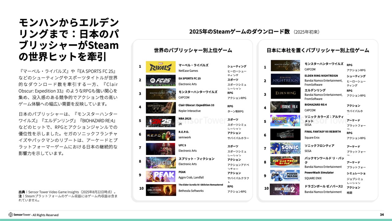 『マーベル・ライバルズ』や『EA Sports FC 25』などのシューティングやスポーツタイトルが世界的なダウンロード数を牽引する一方、『Clair Obscur: Expedition 33』のようなRPGも強い関心を集め、没入感のある競争的でアクション性の高いゲーム体験への幅広い需要を反映しています。