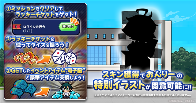 イベント期間中は、ログインやミッションをクリアすることでラッキーチケットを獲得できる。ラッキーチケットを使用することでサイコロを振ることができ、イベントアイテム「電子脳」が手に入る。電子脳はショップにて豪華アイテムなどと交換することが可能。