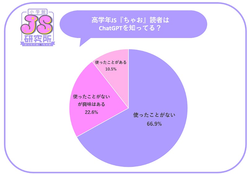 『ちゃお』2025年6月号アンケートで、最新の生成AIであるChatGPTの利用状況について調べたところ、10.5%が「使ったことがある」と回答。「使ったことはないが興味はある」(22.6%)と合わせると、約3人に1人が関心を持っていることがわかりました。