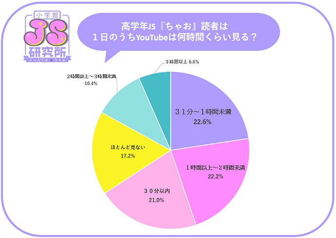 『ちゃお』2025年6月号BIGアンケートで、1日のスマートフォン・タブレットの利用について、SNS・動画プラットフォーム別の利用時間を調査した。その結果、YouTubeを利用しているJSは82.8%にのぼり、「1時間以上~2時間未満」(22.2%)、「2時間以上~3時間未満」(10.4%)、「3時間以上」(6.6%)を合わせた1時間以上視聴している人の割合は39.2%となった。