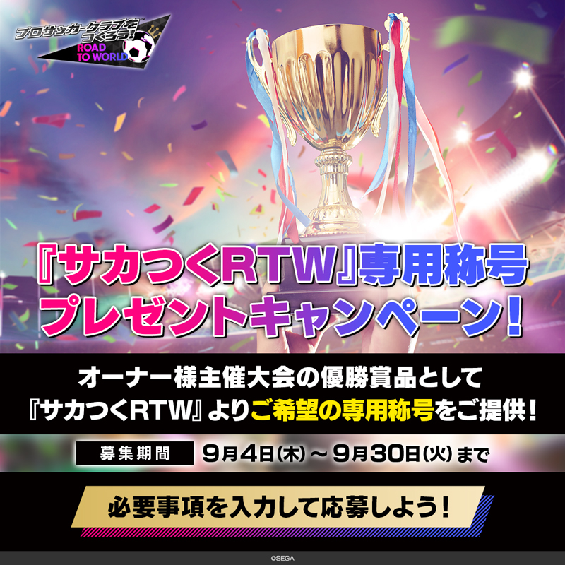 「サカつくRTW」ユーザー主催大会の優勝賞品として、「サカつくRTW」運営チームより“大会オリジナル称号”を提供する、「サカつくRTW」公式X(@sakatsuku_com)との連動企画。