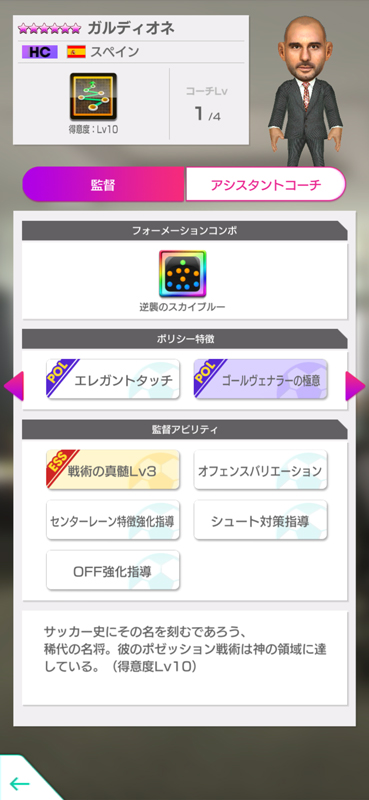 該当の選手を編成すると強くなるフォーメーションコンボ「逆襲のスカイブルー」と戦術得意度Lv10を持つ新★6監督「ガルディオネ」が登場!