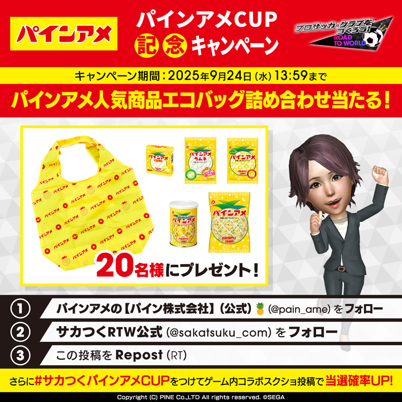 “LIMITED MATCH パインアメ CUP”開催を記念して、フォロー&リポストキャンペーンを実施中です。期間中、「パイン株式会社」公式 Xアカウント(@pain_ame)と「サカつくRTW」公式 Xアカウント(@sakatsuku_com)をフォローのうえ、対象投稿をリポストした方から抽選で20名様に、「パインアメオリジナルエコバッグ&商品詰め合わせ」をプレゼントします。奮ってご参加ください。
