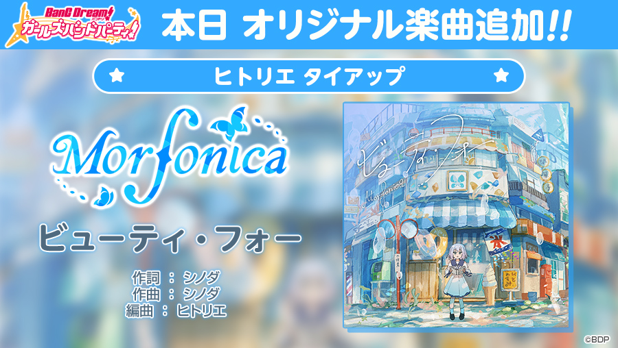 ブシロード<7803>は、スマートフォン向けゲーム「バンドリ! ガールズバンドパーティ!」(以下、ガルパ)にて、アーティストタイアップとして、ヒトリエさんからMorfonicaへの提供楽曲『ビューティ・フォー』をゲーム内に追加した。