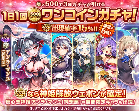 SSRが15%の確率で手に入り、SSRの場合は一部期間限定を含む神姫が必ず出現する3連ガチャ。1日1回のみ購入可能となっており、期間中は毎日15:00に購入可能回数がリセットされる。なんと今回は排出対象に、反想開花・心想昇華ガチャから、神姫「アンラ・マンユ[純想悪]」が加わる。