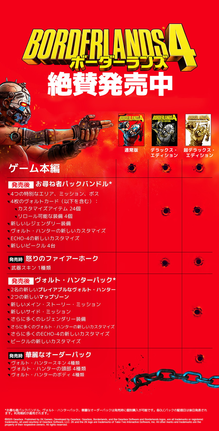 『ボーダーランズ4』は、通常版、デラックス・エディション、超デラックス・エディション の3つのエディションが用意されている。日本では、通常版と超デラックス・エディションのPlayStation5版がパッケージ版、デジタル版共に発売となり、その他プラットフォーム、及びデラックス・エディションは全てデジタル版のみの発売となる。(Nintendo Switch 2 の詳細に関しては後日発表する。)