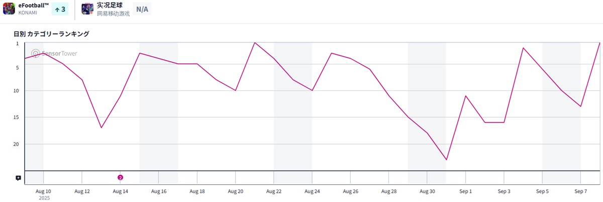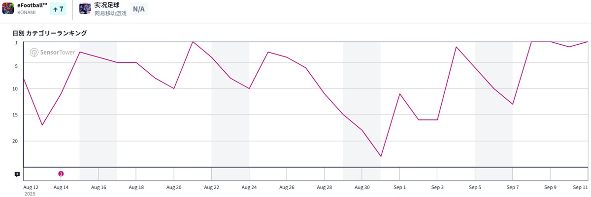 9月12日9時現在のApp Storeセールスランキング(ゲームカテゴリー)は、KONAMIの『eFootball』が再び首位の座についた。