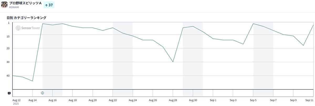 同じくKONAMIから、『プロ野球スピリッツA』も15ランクアップで3位と好調だ。